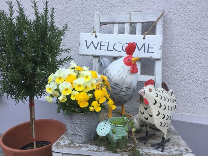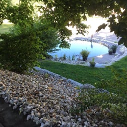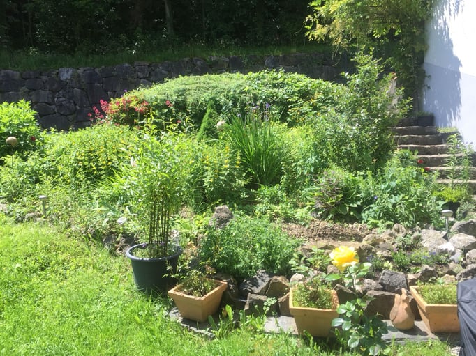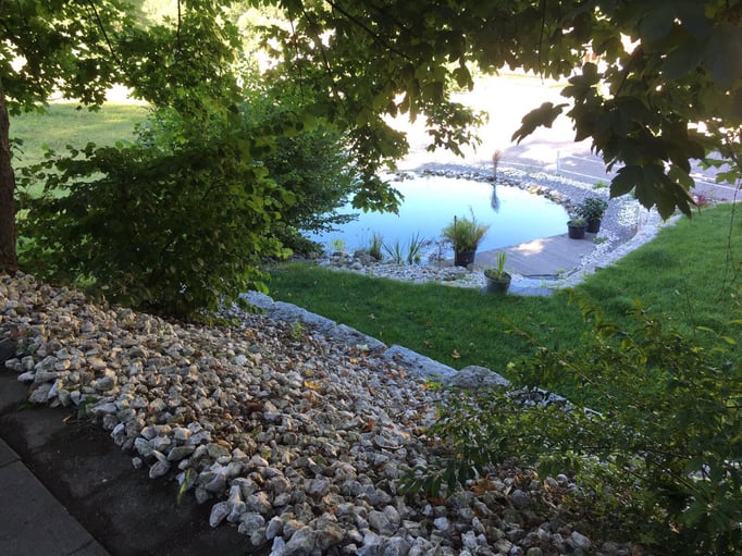 Wir haben auch einen Garten hinter dem Hause mit einem Teich und Platz zum Verweilen.